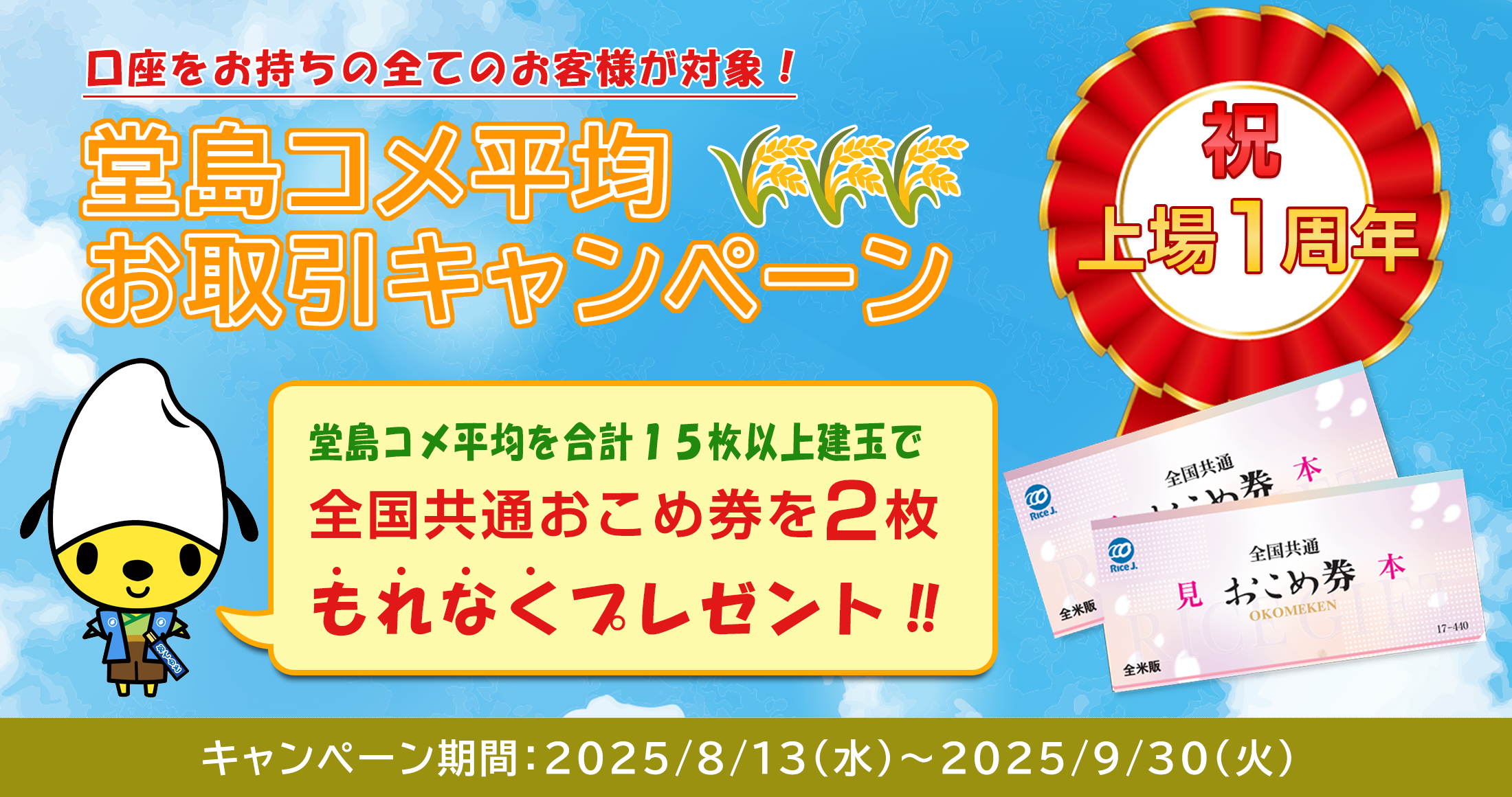 北辰物産は、堂島コメ平均の取引キャンペーンを実施する。3月3日から31日まで、同社の口座保有者が対象。期間中に10枚以上の建玉で全国共通おこめ券2枚(880円分)を進呈する。