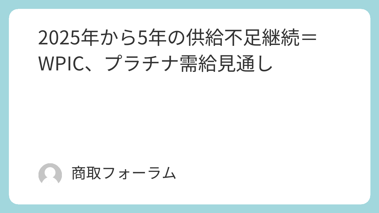 ワールド・プラチナム・インベストメント・カウンシル(WPIC)は2025年から2029年にかけ、プラチナ市場は年間平均62万オンスの供給不足が続くと予測した。価格上昇にもかかわらず、供給増加は限定的で需給バランスは引き続きタイトな状況だ。