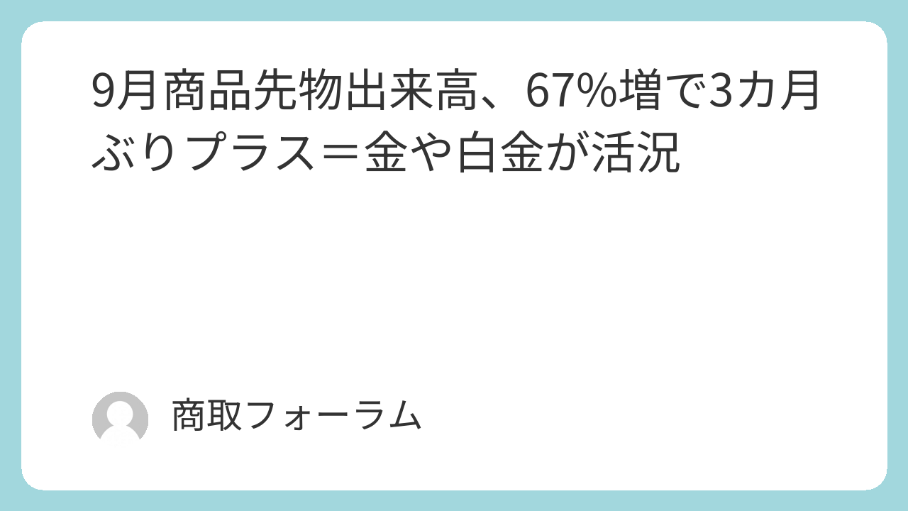 日本取引所グループなどが発表した9月の国内商品先物総出来高は、前月比66.9%増の179万6332枚となり、3カ月ぶりに増加した。前年同月比では36.4%増。一日平均出来高(立会日数20日)は8万9817枚だった。米国の金融・政治情勢への懸念から安全資産とされる貴金属に投資資金が流入し、市場全体をけん引した。