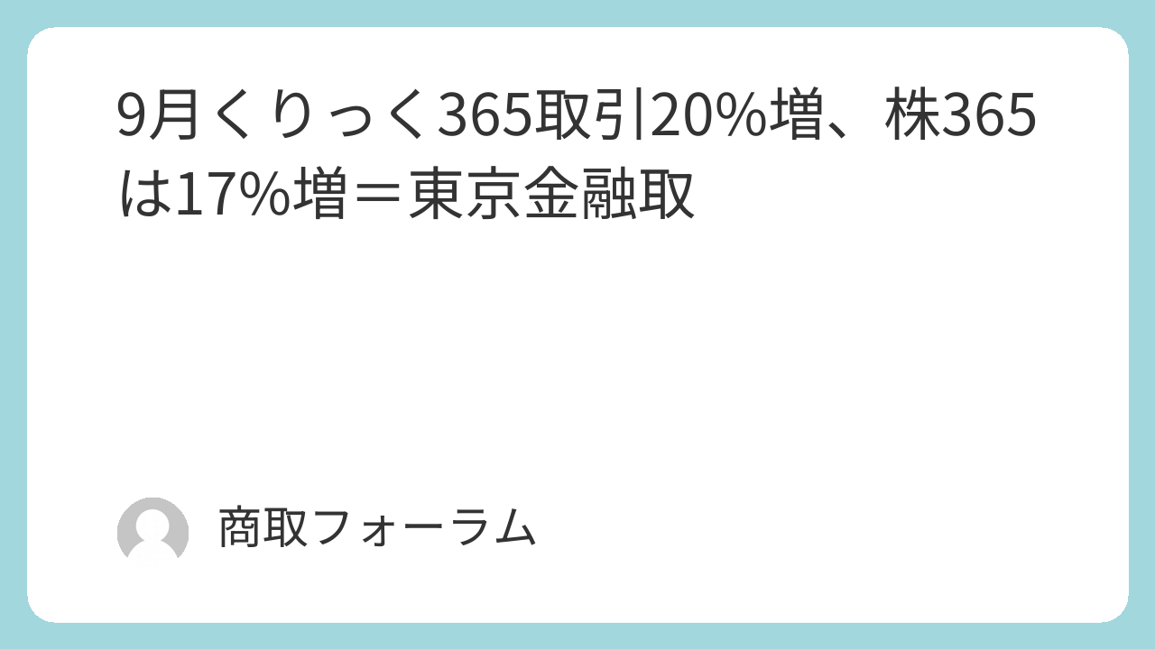 東京金融取引所が1日発表した9月の取引数量で、為替証拠金取引「くりっく365」は前月比19.6%増の142万枚に回復した。株価指数証拠金取引「くりっく株365」も17.1%増の375万枚と堅調だった。