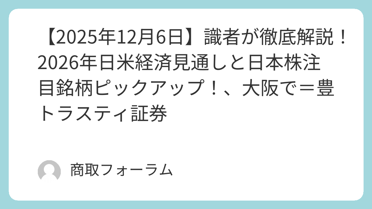 豊トラスティ証券は12月6日、大阪市のTKPガーデンシティPREMIUM心斎橋で「識者が徹底解説!2026年日米経済見通しと日本株注目銘柄ピックアップ!」セミナーを開催する。第一生命経済研究所の永濱利廣氏や株式アナリストの鈴木一之氏らを講師に迎え、2026年の日米マーケットについて経済、為替、株式など様々な視点から解説。定員は70名で、応募多数の場合は抽選となる。