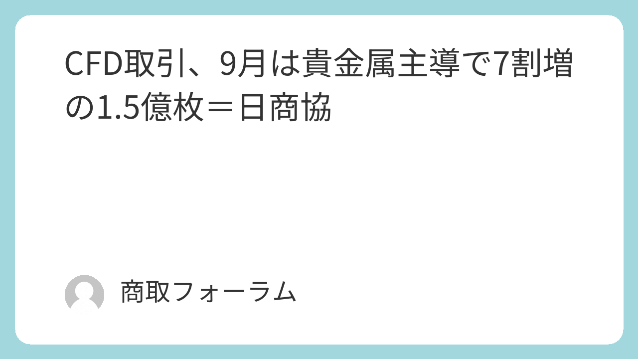 日本商品先物取引協会がまとめた2025年9月の店頭商品CFD(差金決済取引)の取引件数は、前月比68.3%増の1億5157万9964枚と急増した。世界的な金融市場の変動を背景に、金を中心とした貴金属への投資が活発化し、個人投資家の資金流入が顕著となった。なお、同月の国内商品先物市場の総出来高は前月比66.9%増の179万6332枚だった。