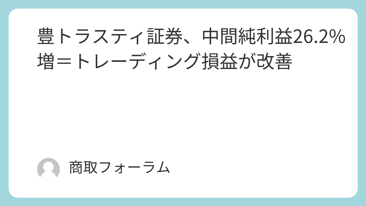 豊トラスティ証券、中間純利益26.2%増=トレーディング損益が改善