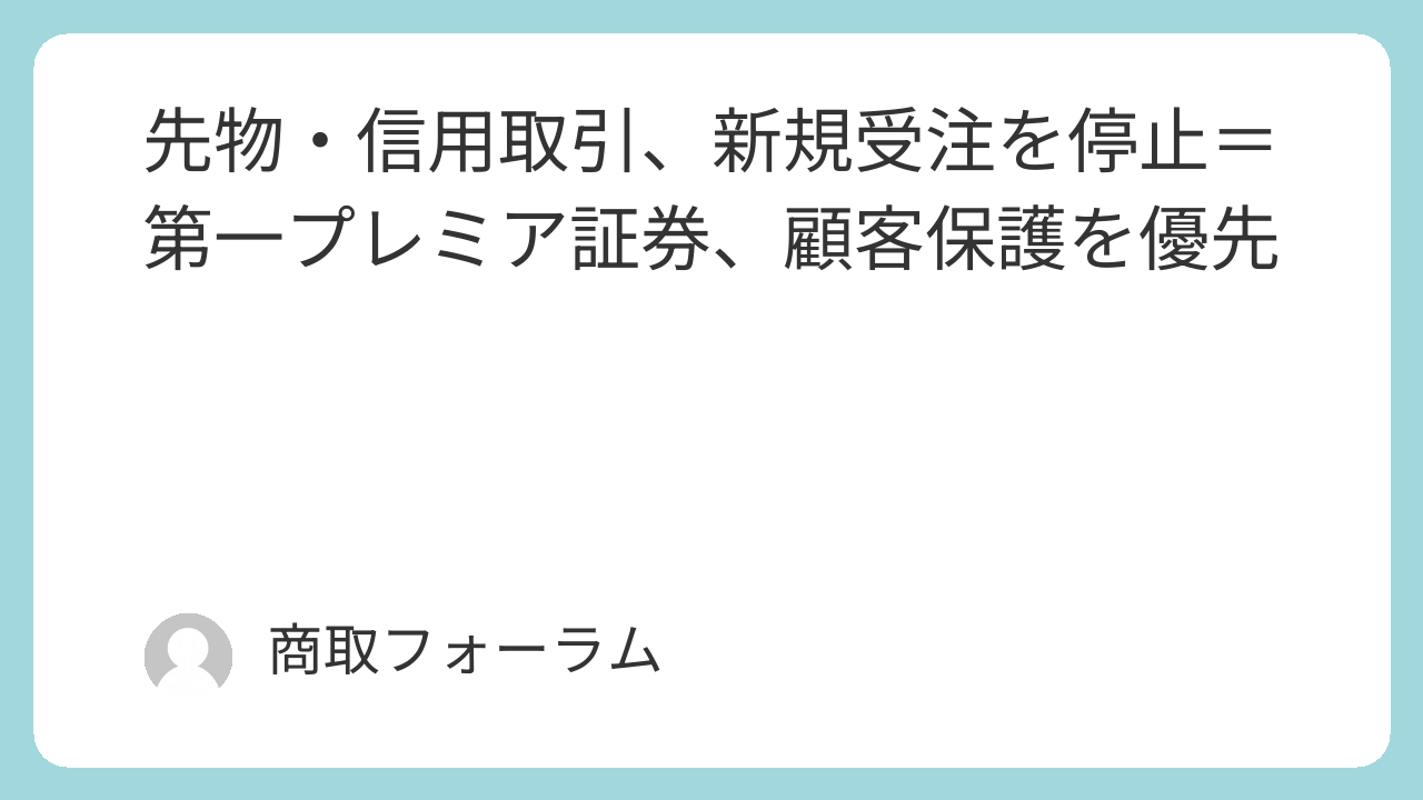 先物・信用取引、新規受注を停止=第一プレミア証券、顧客保護を優先