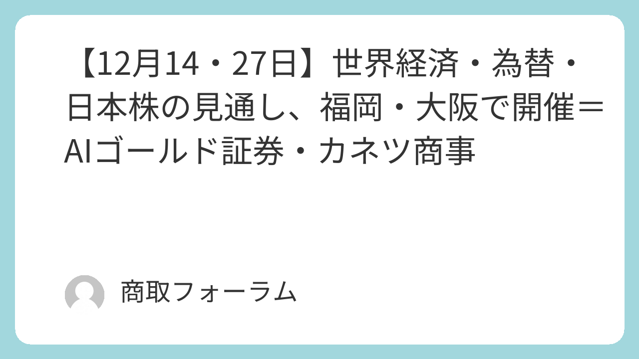 【12月14・27日】世界経済・為替・日本株の見通し、福岡・大阪で開催=AIゴールド証券・カネツ商事