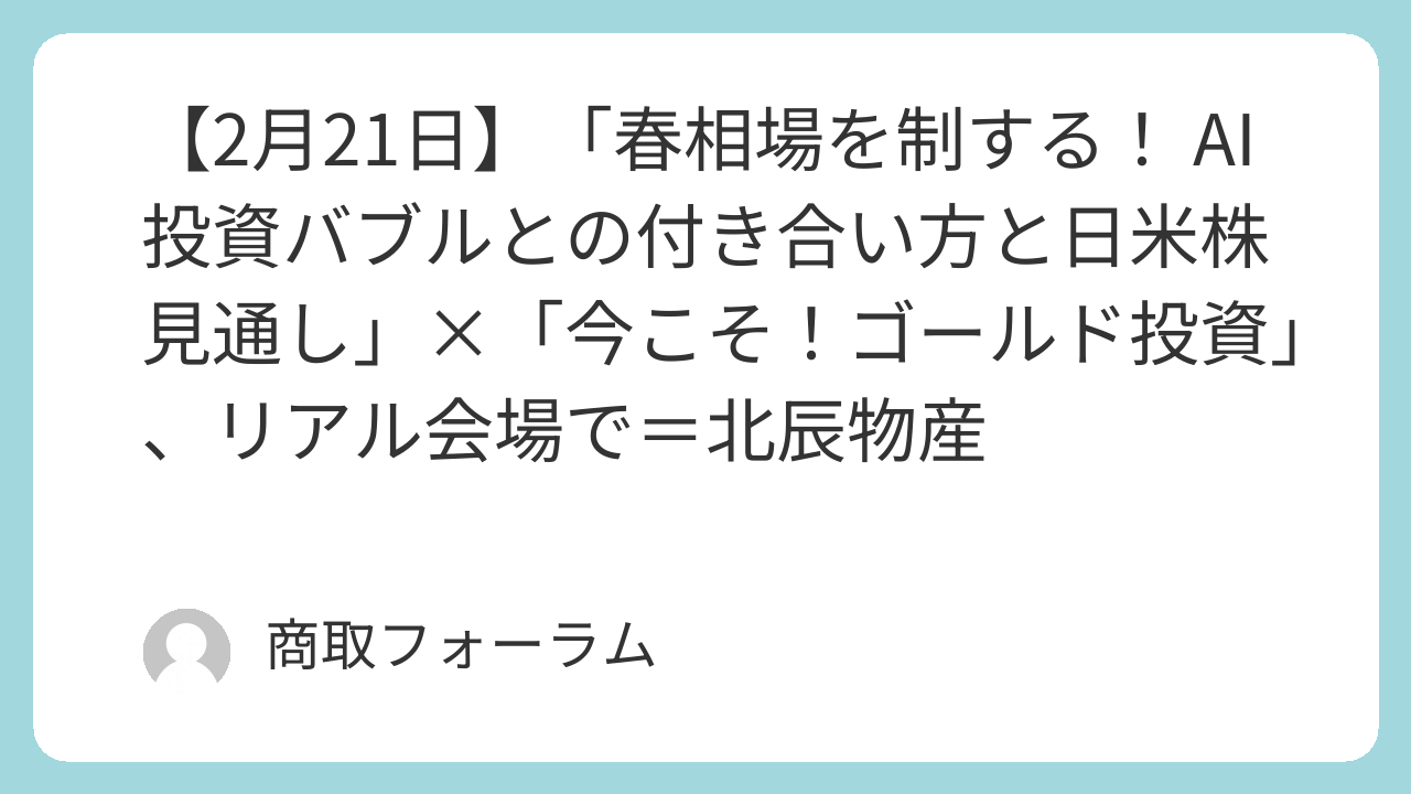 北辰物産は2026年2月21日、東京・日本橋茅場町で「春相場を制する! AI投資バブルとの付き合い方と日米株見通し」および「今こそ!ゴールド投資」と題した無料の投資セミナーを開催する。定員は75名。