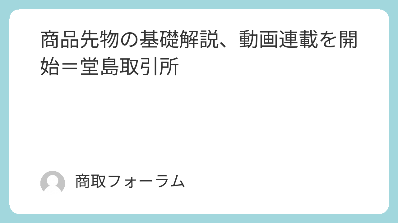 堂島取引所は10日、商品先物取引の仕組みを解説する動画の連載を動画投稿サイト「ユーチューブ」で始めたと発表した。全6回のシリーズ形式で、第一弾として商品先物や指数先物の基礎を公開。投資初心者への啓蒙を図り、市場参加者の裾野拡大を狙う。