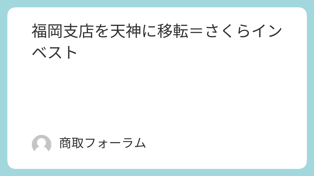 さくらインベストは22日、福岡支店を移転したと発表した。同日付で福岡市中央区のオフィスビル「天神ビジネスセンター」に入居した。新拠点での営業を通じて顧客対応を強化する。