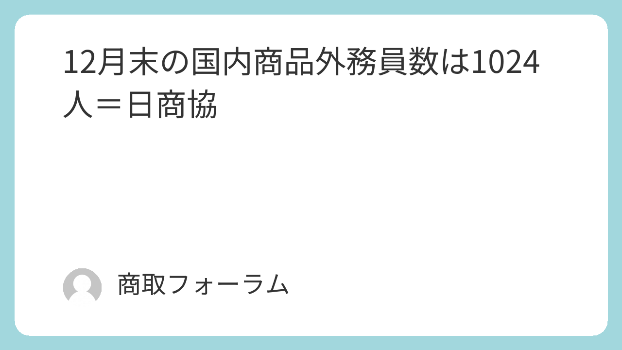 日本商品先物取引協会がまとめた12月末の登録外務員総数は前月比59人増の2万1592人となった。国内商品市場の外務員数は同2人減の1024人。店頭デリバティブ取引は同61人増の2万529人となった。外国商品市場取引(7人)と仲介(32人)は前月から横ばいだった。