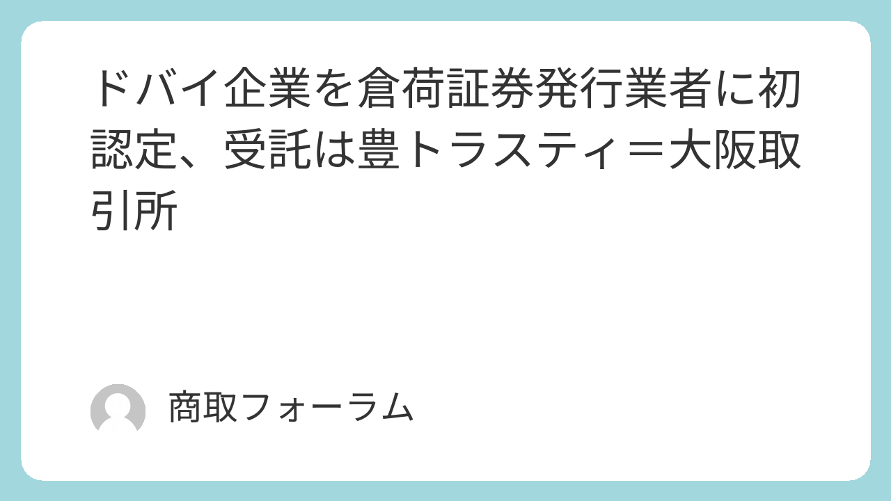 大阪取引所は2月3日、貴金属トレーダーのヴィンテージ・ブリオンDMCC(アラブ首長国連邦・ドバイ)を倉荷証券発行の認定業者に指定した。海外法人の認定は初。受託取引参加者には豊トラスティ証券が就いた。