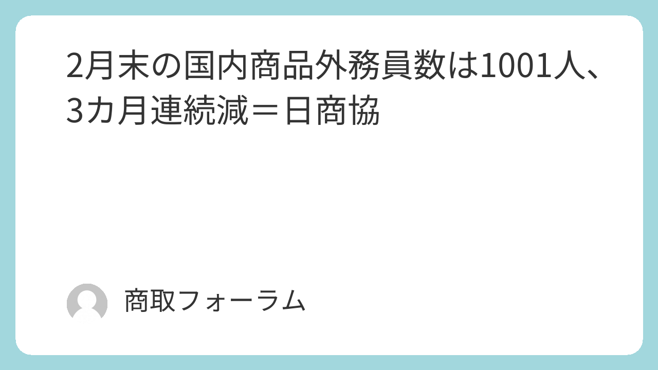 日本商品先物取引協会が2日発表した2月末の国内商品市場の外務員数は、前月末比10人減の1001人となった。3カ月連続の減少。全体の登録外務員数は174人減の2万1440人だった。