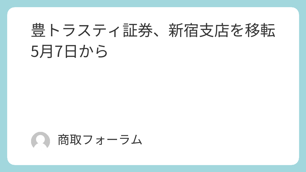 豊トラスティ証券は1日、新宿支店を同年5月7日付で移転し、新所在地での営業を開始すると発表した。