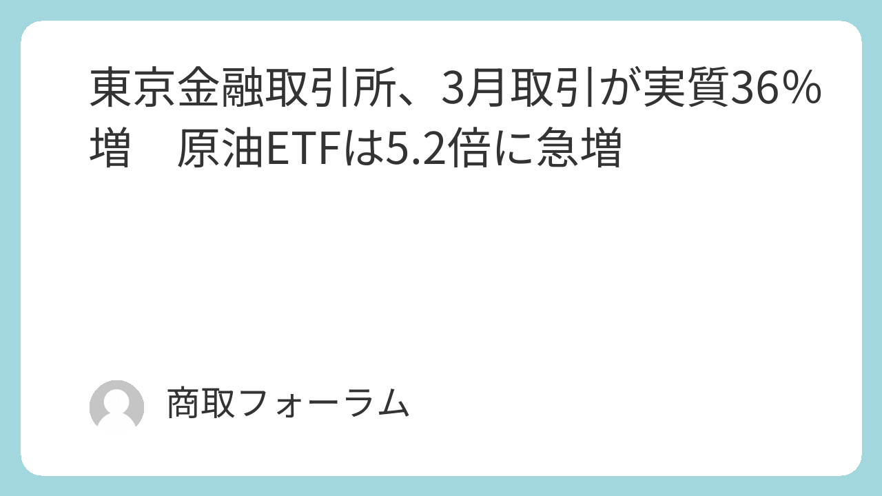 個別銘柄(リセット付)の3月実績では、原油ETFが前月比約5.2倍(419.0%増)の62万9509枚と急増した。一方、金ETFは8万7903枚(35.7%減)、銀ETFは2万7724枚(52.5%減)、プラチナETFは3410枚(48.4%減)となった。