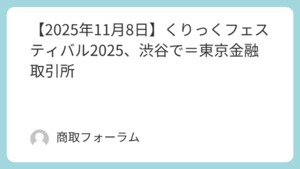 セミナー・イベント 【2025年11月8日】くりっくフェスティバル2025、渋谷で=東京金融取引所 東京金融取引所とパンローリングは11月8日、ベルサール渋谷ファーストで「くりっくフェスティバル202... 2025.10.02 セミナー・イベント