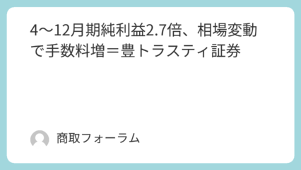 4~12月期純利益2.7倍、相場変動で手数料増=豊トラスティ証券