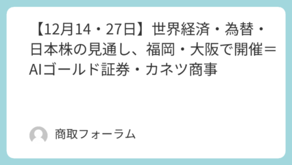 【12月14・27日】世界経済・為替・日本株の見通し、福岡・大阪で開催=AIゴールド証券・カネツ商事