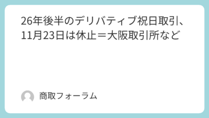 大阪取引所と東京商品取引所は19日、2026年下半期におけるデリバティブ(金融派生商品)の祝日取引実...