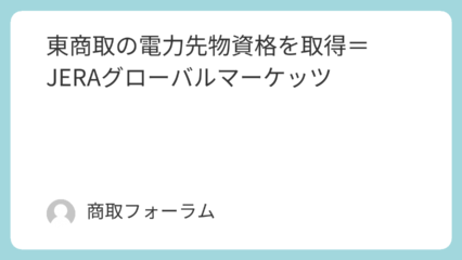 取引所 東商取の電力先物資格を取得=JERAグローバルマーケッツ 東京商品取引所は15日、JERAグローバルマーケッツに電力先物市場の取引参加資格を付与したと発表した... 2025.12.15 取引所業界ニュース